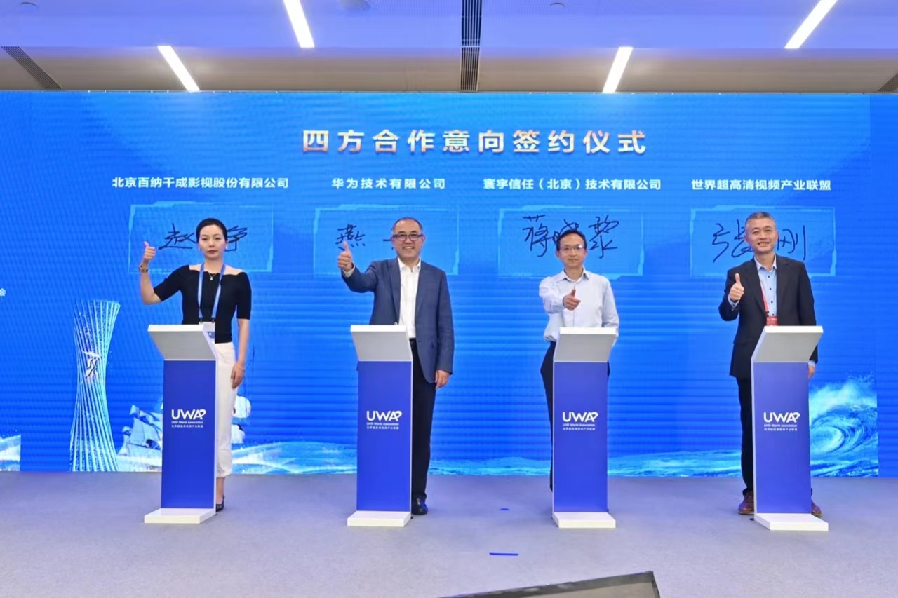 當(dāng)天下午舉行的Audio & HDR Vivid生態(tài)發(fā)展圓桌會上,在國家廣電總局領(lǐng)導(dǎo)以及與會嘉賓的見證下,由寰宇信任(北京)技術(shù)有限公司總經(jīng)理蔣曉黎與百納千成IP商務(wù)總經(jīng)理趙靜女士、世界超高清視頻產(chǎn)業(yè)聯(lián)盟秘書長張文剛、華為技術(shù)有限公司產(chǎn)業(yè)發(fā)展副總裁燕興,共同簽訂了《四方合作諒解備忘錄》。四方擬在基于5G、F5G、云計算、4K/8K、高動態(tài)范圍視頻標(biāo)準(zhǔn)(HDR Vivid)、三維聲編解碼(Audio Vivid)、數(shù)字版權(quán)保護(hù)(ChinaDRM)、國產(chǎn)自主可控圖形引擎、人工智能、NFT等技術(shù)賦能影視、超高清內(nèi)容創(chuàng)作、拍攝、制作、網(wǎng)絡(luò)平臺發(fā)行、放映及影視文化關(guān)聯(lián)產(chǎn)業(yè)創(chuàng)新等方面建立長期全面穩(wěn)定的合作關(guān)系,打造具有示范引領(lǐng)作用的影視產(chǎn)業(yè)科技創(chuàng)新高地。