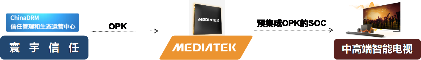 為了進(jìn)一步提升芯片的適用性,MTK與ChinaDRM數(shù)字版權(quán)保護(hù)信任管理中心(DRM Trust Authority,簡稱DTA)合作,基于DTA提供的ChinaDRM2.0客戶端開發(fā)包(OEM Porting Kit,簡稱OPK)在9653芯片上完成了ChinaDRM2.0能力的預(yù)集成。相比MTK此前的解決方案,OPK在可移植性、標(biāo)準(zhǔn)符合性、功能上都有著顯著的優(yōu)勢,芯片集成OPK難度低、工作量少、易于通過評測,同時能滿足互聯(lián)網(wǎng)視頻應(yīng)用場景下DRM功能要求,支持DRM設(shè)備證書空口下載功能也極大的降低了終端置入DRM證書的復(fù)雜度。MTK在芯片層面完成OPK預(yù)集成,終端廠商集成OPK的工作量大大降低,大幅縮短了設(shè)備端研發(fā)及生產(chǎn)的成本投入。在DTA的ChinaDRM生態(tài)服務(wù)支持下,在芯片中預(yù)置DRM設(shè)備證書空口下載能力,這將顛覆性地改變傳統(tǒng)的證書產(chǎn)線燒寫模式,為產(chǎn)業(yè)規(guī)模的提升打開了空間。